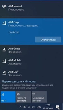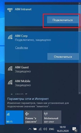 12. После успешной настройки VPN подключения мы нажимаем на пиктограмму Wi-fi в области уведомлений и подключаемся к AIM Intranet