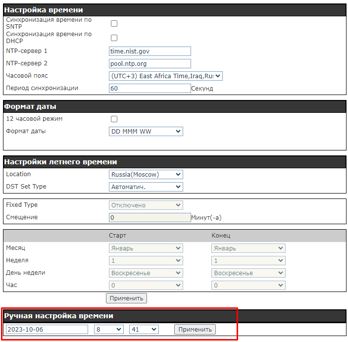 4. В пункте «Ручная настройка времени» меняем дату и время. Нажимаем «Применить»