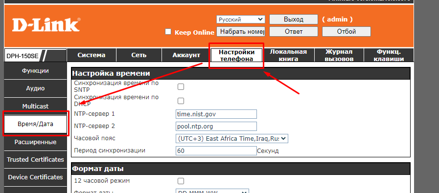 - Далее, переходим во вкладку «Настройка телефона — Время/Дата»