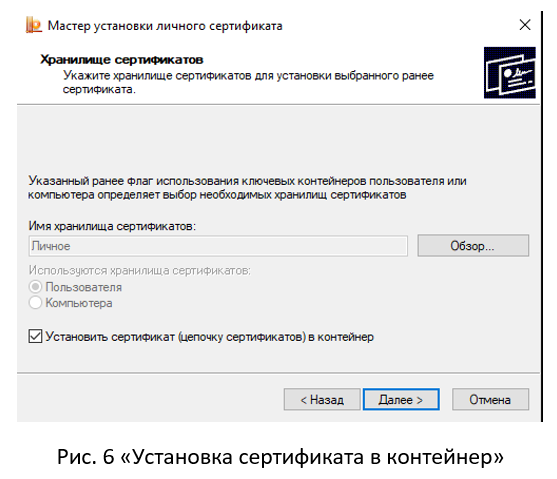 Рекомендуется поставить галочку напротив слов «Установить сертификат (цепочку сертификатов) в контейнер». Установка сертификата в контейнер не является обязательным условием для работы с электронной подписью в системах, оператором которых является Федеральное казначейство (Рис. 6 «Установка сертификата в контейнер»). После выбора хранилища необходимо нажать кнопку «Далее».