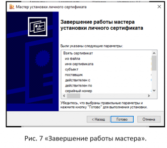 В окне «Завершение работы мастера установки личного сертификата» необходимо нажать кнопку «Готово» (Рис. 7 «Завершение работы мастера»).