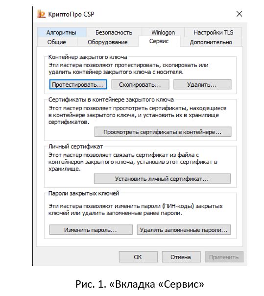 Для установки сертификата необходимо запустить КриптоПро CSP, открыть вкладку «Сервис» (Рис. 1 «Вкладка «Сервис»), нажать кнопку «Установить личный сертификат…», откроется окно «Мастер установки личного сертификата» (Рис. 2 «Мастер установки личного сертификата»).
