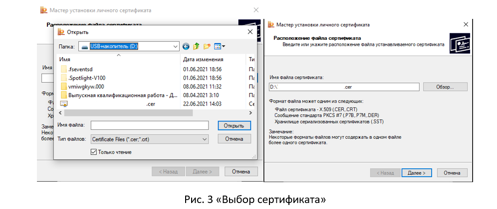 В данном окне необходимо нажать кнопку «Обзор…» и выбрать сертификат, полученный в Удостоверяющем центре (Рис. 3 «Выбор сертификата»).