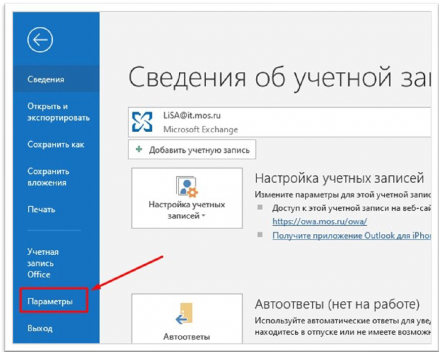 2. По левой стороне меню требуется выбрать пункт «Параметры»