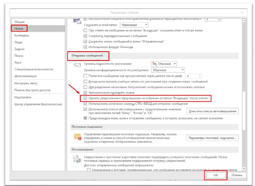 4. Далее требуется в разделе «Отправка сообщений» деактивировать (снять) чек-бокс с пункта «Удалять уведомления и приглашения на собрание из папки «Входящие» после ответа», и применить изменения, воспользовавшись кнопкой «ОК»