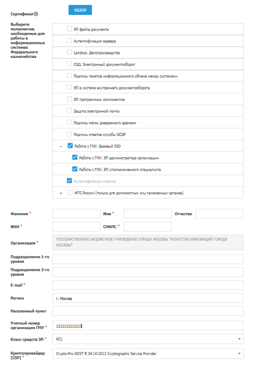 Для работы на сайте ГМУ необходимо раскрыть ветку «Работа с ГМУ. Базовый OID», затем отметить соответствующие роли участника и пользователя сайта ГМУ, пункт «Аутентификация клиента», который выбран по умолчанию, и заполнить обязательное поле «Учетный номер организации ГМУ» (Рисунок 1).