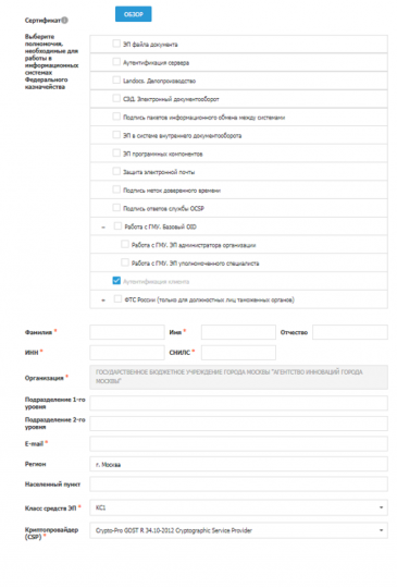 Выбор полномочий при формировании запроса на сертификат с помощью портала заявителя «Формирование запросов на сертификаты» (ФЗС)