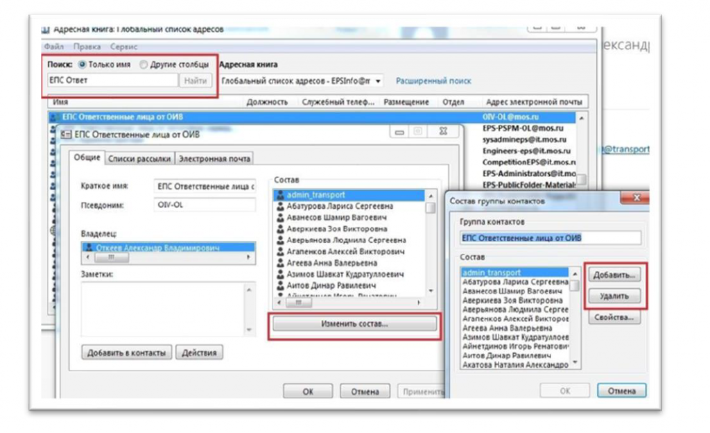 2. Находим нужную группу рассылки, открываем её. На вкладе «Общие» для изменения состава группы выбираем кнопку «Изменить состав», в открывшемся окне «Состав группы контактов» с помощью команд «Добавить» и «Удалить» регулируем состав группы рассылки.