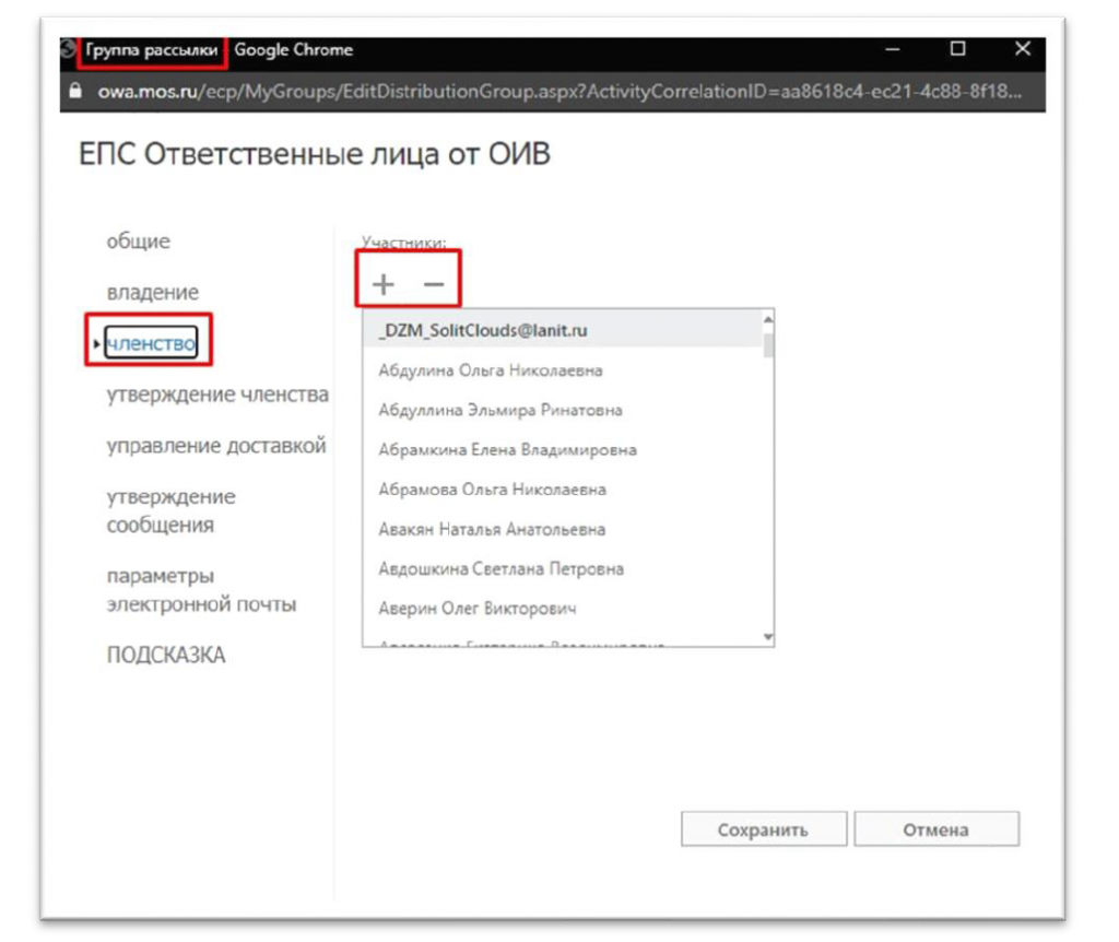 3. Выбираем необходимую для редактирования группу, в окне «Группа рассылки». В разделе «Членство» добавляем пользователей из адресной книги ЕПС с помощью символа «+«, удаляем выбранного пользователя с помощью символа «—«.