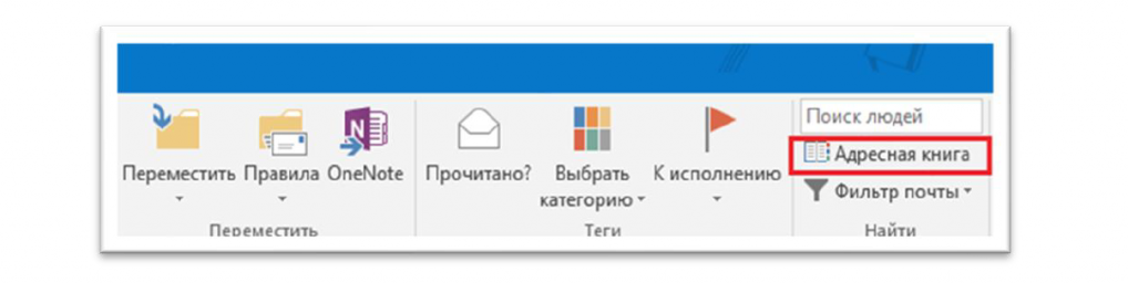 - В почтовом клиенте Outlook в группе команд «Найти» на ленте Office открываем «Адресную книгу»