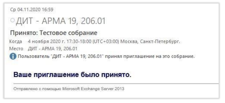 5. После нажатия кнопки «Отправить» направляется сообщение всем участникам собрания, в том числе переговорной комнате. Если переговорная на указанное время свободна, то придёт сообщение о принятии. Если переговорная на указанное время занята, то придёт сообщение об отклонении.
