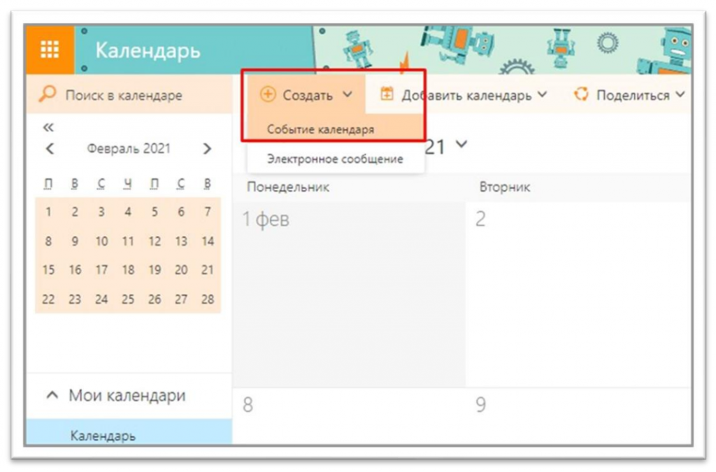 2. Выберете раздел «Создать» и нажмите на пункт «Событие календаря»