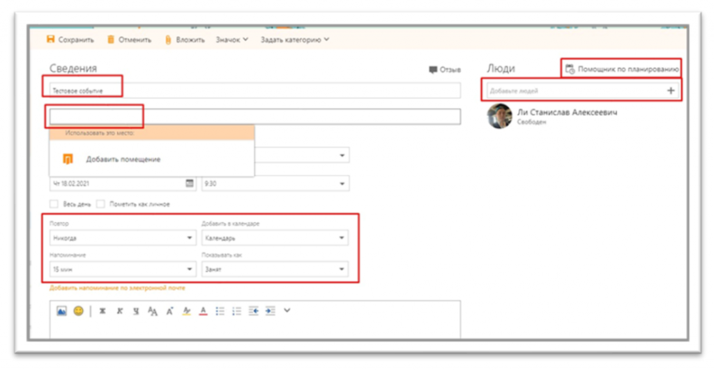 8. Переговорная комната забронирована. Все необходимые изменения в собрание вносятся через событие, размещенное в Вашем личном календаре. После отправки изменений собрание в календаре переговорной комнаты меняется автоматически.