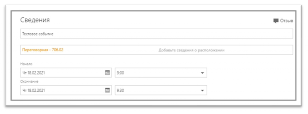 5. Добавленная переговорная появится в окне создаваемого собрания. При необходимости внесите дополнительные данные и нажмите кнопку «Отправить».