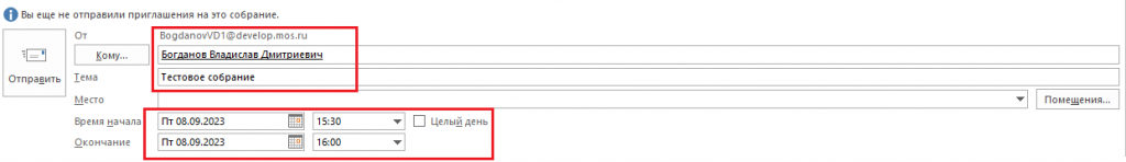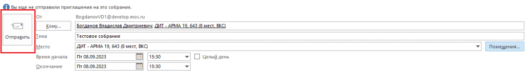 6. После нажатия кнопки «Отправить» направляется сообщение всем участникам собрания, в том числе переговорной комнате. Если переговорная на указанное время свободна, то придёт сообщение о принятии. Если переговорная на указанное время занята, то придёт сообщение об отклонении.