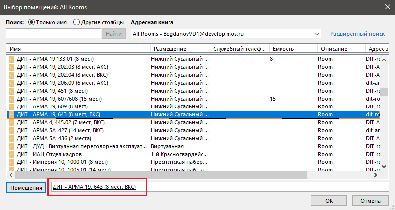 3. В открывшемся окне адресной книги выберите необходимую переговорную комнату и