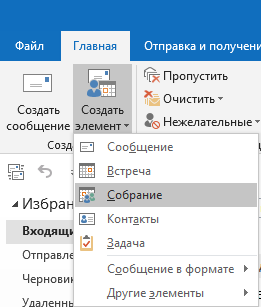 1. На вкладке «Главная», в группе команд «Создать», выберите команду «Создать элемент», затем в открывшемся списке выберите команду «Собрание».