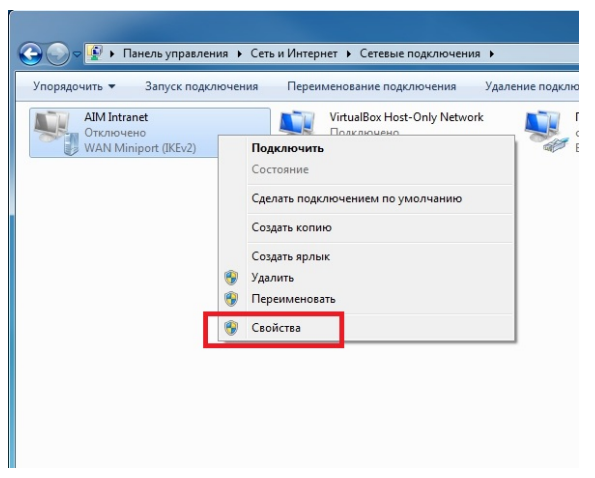 - Ищем в списке наше VPN подключение «AIM Intranet» и открываем свойства