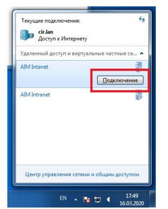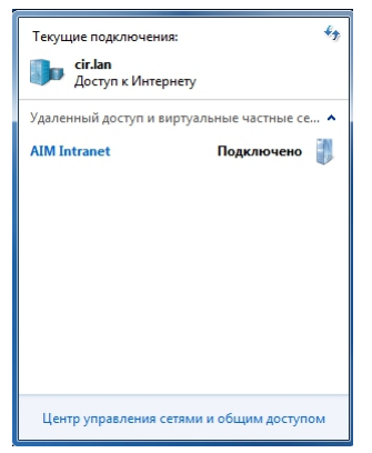13. После успешной настройки VPN подключения мы нажимаем на значок с монитором в области уведомлений и подключаемся к «AIM Intranet».