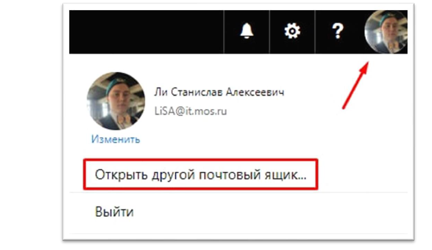 - Необходимо зайти в почтовый ящик и в правом верхнем углу окна браузера нажать на иконку Вашей учетной записи. При нажатии на нее, откроется окно, в котором необходимо выбрать команду «Открыть другой почтовый ящик»