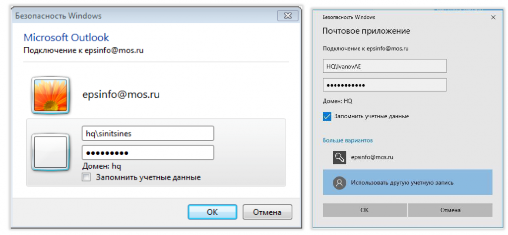 6. Выбираем «Другая учетная запись» и вводим логин и пароль от доменной учетной записи, выставляем галочку «Запомнить учетные данные» для Windows 7 (для Windows 10 необходимо выбрать «Использовать другую учётную запись»)
