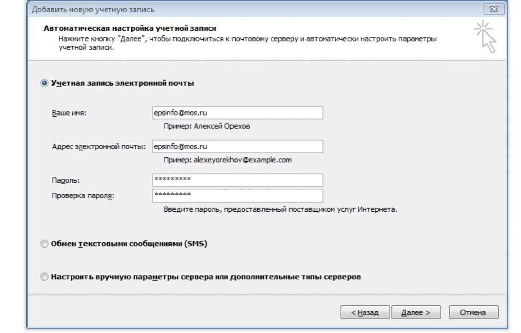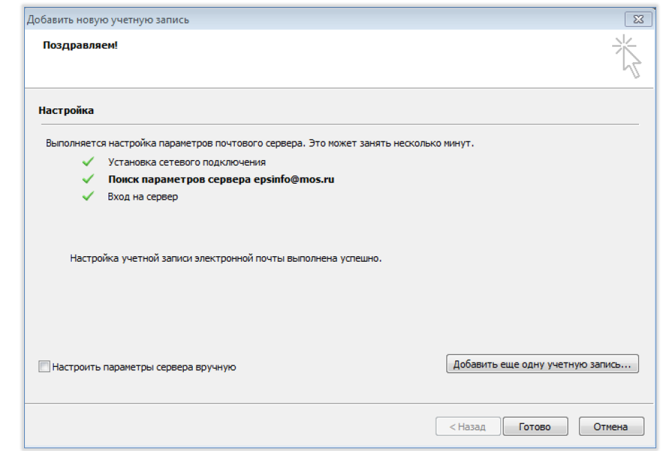 Примечание: В поле «Пароль» вводим пароль для доменной учетной записи. В поле «Адрес электронной почты» вводим адрес общего почтового ящика.