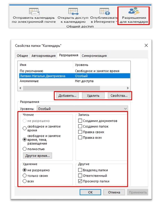 4. Для редактирования, изменения или удаления доступа необходимости перейти в раздел «Разрешения для календаря«.