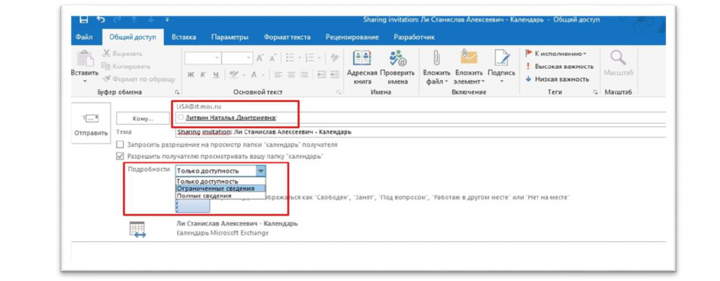 Полные сведения — включает сведения о доступности и полные сведения элементов календаря/