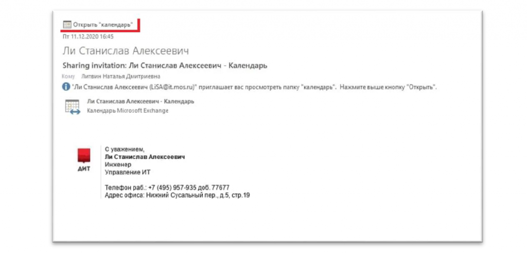 - При поступлении письма о предоставлении доступа необходимо нажать «Открыть календарь».