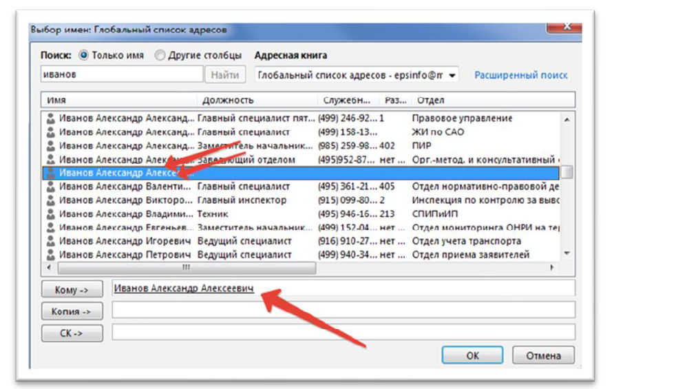 Для добавления необходимых получателей необходимо дважды нажать на его имя в поиске.