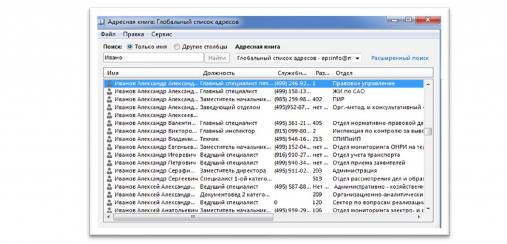 Совпадения отобразятся в окне адресной книги. Чтобы просмотреть контакт, необходимо кликнуть по его имени два раза.