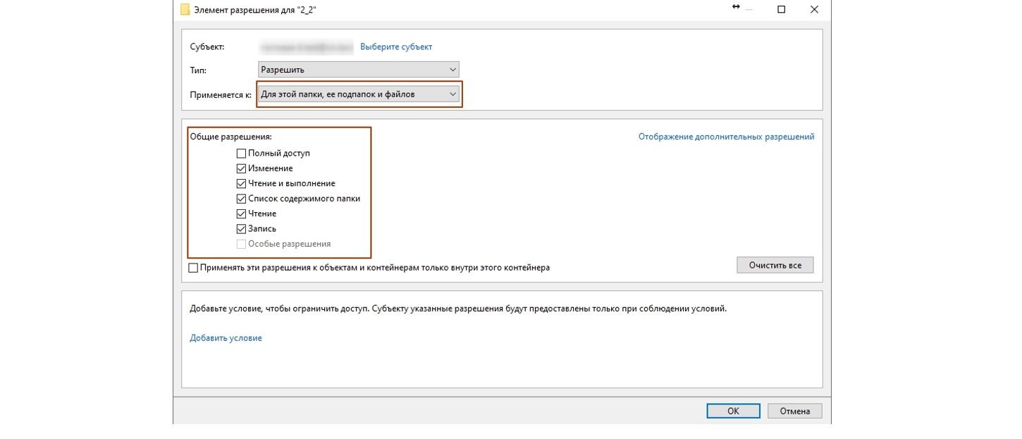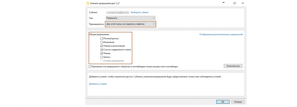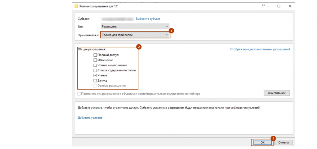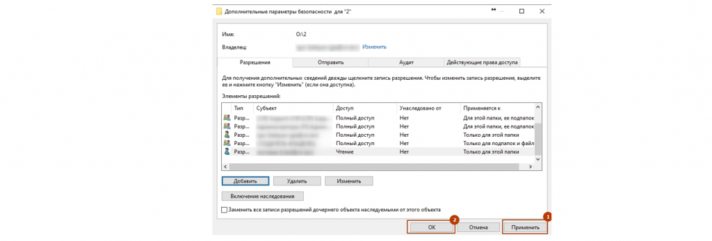 7. Если папка, к которой предоставляется доступ не конечная в пути, то права необходимо выставлять следующие. После того, как мы выбрали к чему применяется субъект (1) и его разрешения (2), нажимаем «ОК»