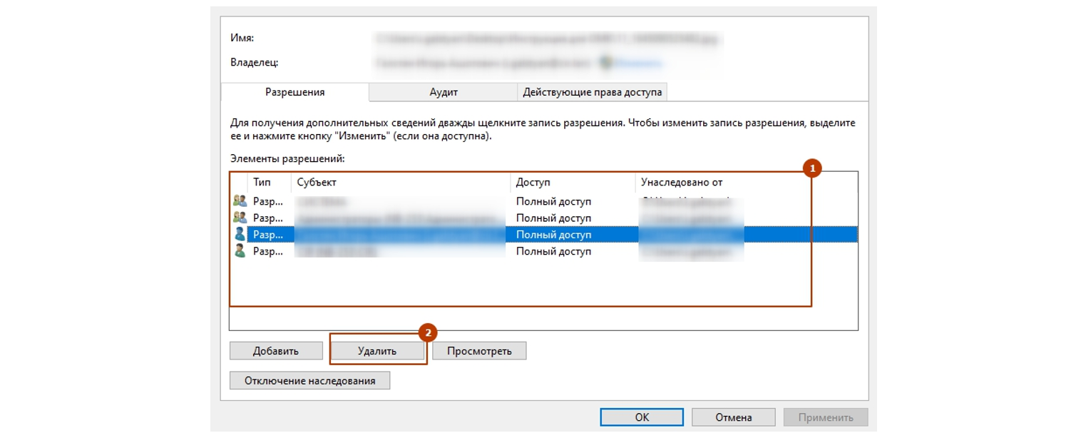 10. Для того, чтобы удалить того или иного субъекта, в окне дополнительных параметров безопасности необходимо из списка субъектов (1) выбрать нужный субъект и нажать «Удалить» (2)