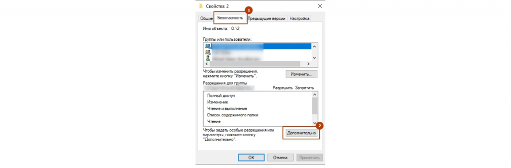 3. В свойствах папки открываем вкладку «Безопасность» (1). Чтобы задать разрешения и параметры доступа для определенного пользователя, переходим на вкладку «Дополнительно» (2).