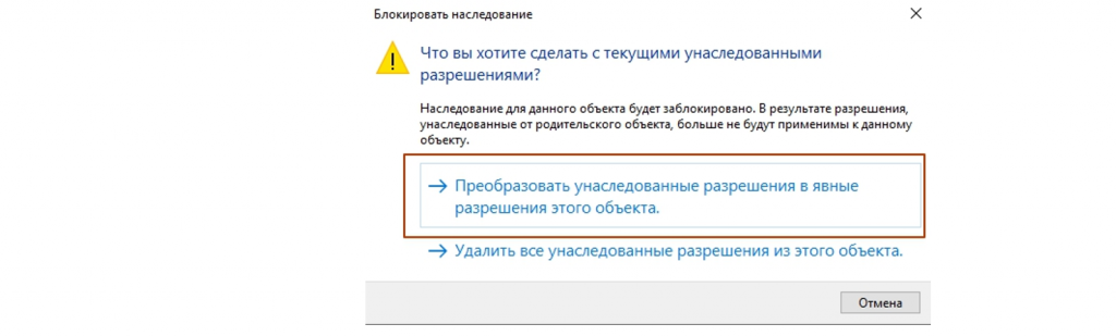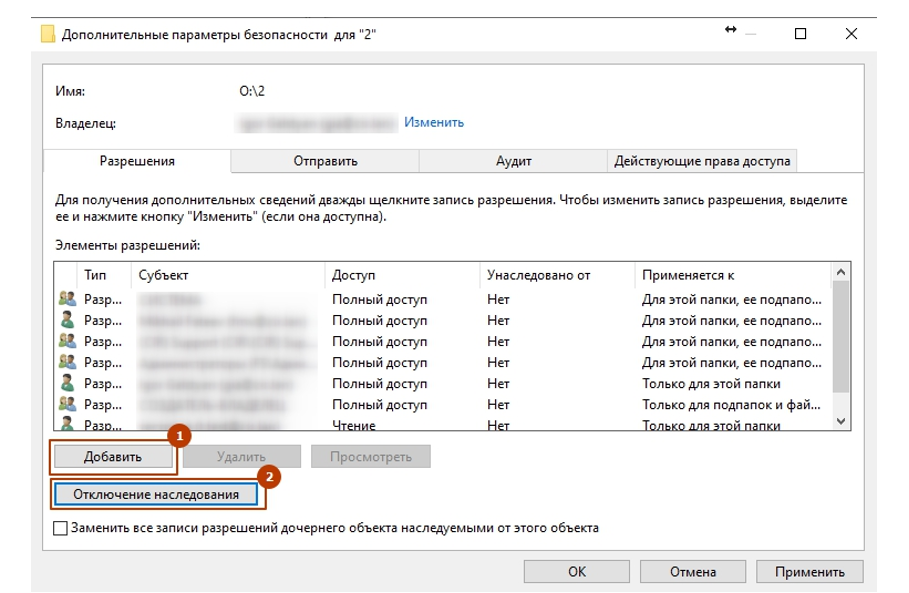 ВАЖНО! Перед тем, как предоставить права доступа субъекту, необходимо отключить наследование сетевой папки (2). Далее, выбираем «Преобразовать унаследованные разрешения в явные разрешения этого объекта».