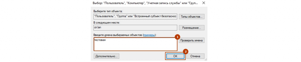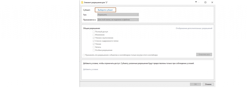 4. Нажимаем «Добавить» (1) и выбираем субъект, которому необходимо предоставить доступ к папке.