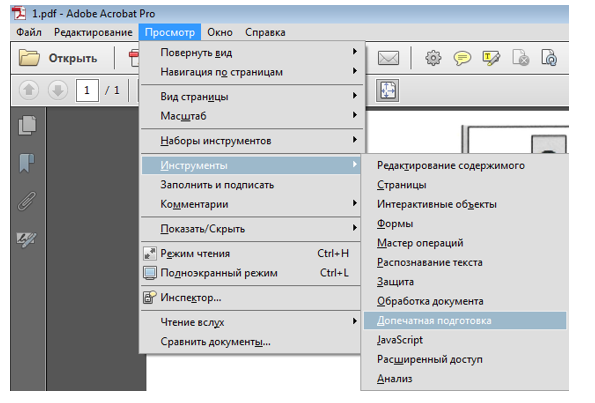 - Acrobat Xl: «Вид» > «Инструменты» > «Допечатная подготовка»