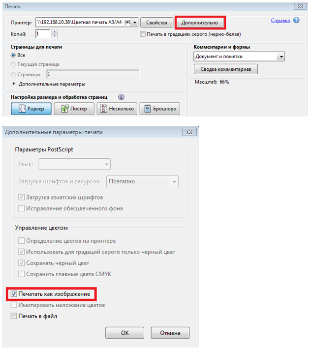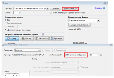 Если вам необходимо выполнить быструю печать простого документа (например, письма или бланка), используйте параметр «Печатать как изображение». Чтобы выбрать этот параметр, в диалоговом окне «Печать» нажмите кнопку «Дополнительно» (В ОС Windows 7 кнопка «Дополнительно» располагается в нижней части диалогового окна).