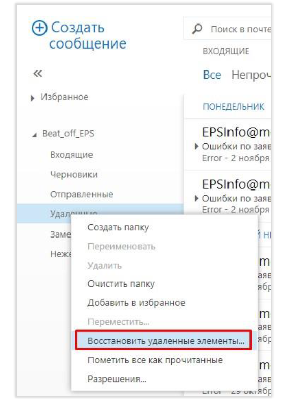 - Авторизуемся в почтовый ящик (персональный или общий) и нажимаем правой кнопкой мыши на папку «Удаленные», в контекстном меню выбираем пункт «Восстановить удаленные элементы…»