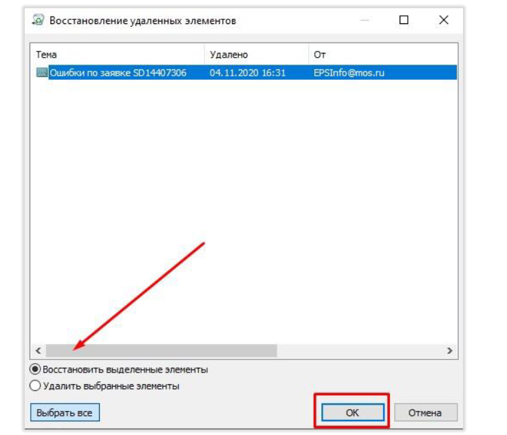 2. В открывшемся окне «Восстановление удаленных элементов» выбираем необходимые нам письма и нажимаем кнопку «Восстановить»