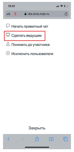 18. Чтобы другие участники конференции могли оставлять пометки на презентации или работать с ней, нажмите на название комнаты в левом верхнем углу, далее на участники и выберите «Сделать ведущим»