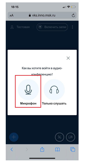 5. Далее выбираем как вы хотите войти в конференцию. Для того, что бы микрофон работал и вы могли разговаривать в конференции, выбираем пункт «Микрофон»