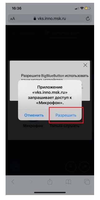6. BigBlueButton запрашивает разрешение на использование микрофона. Нажимаем «Разрешить».