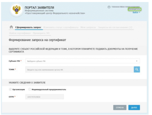 Осуществляем вход в личный кабинет авторизованного пользователя Портала Заявителя с ролью «Руководитель»